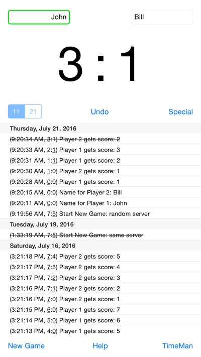 ![]() Key features of the counter: - scoring up to 11 or to 21 (two scores difference is required for win); - user can select (or randomize) who will serve first, then the app will calculate who serves and will display it; - counting is displayed with large font in landscape orientations, herewith tap area for adding score will be almost half of screen; - special mode that allows scoring with volume buttons, the app speaks current state (scores, who serves); so, device can be located in a pocket; - recording detailed history of played games (user can view it in the app, and also can copy it to computer via iTunes); - user can undo activities. TableTennisCounter@gmail.com |